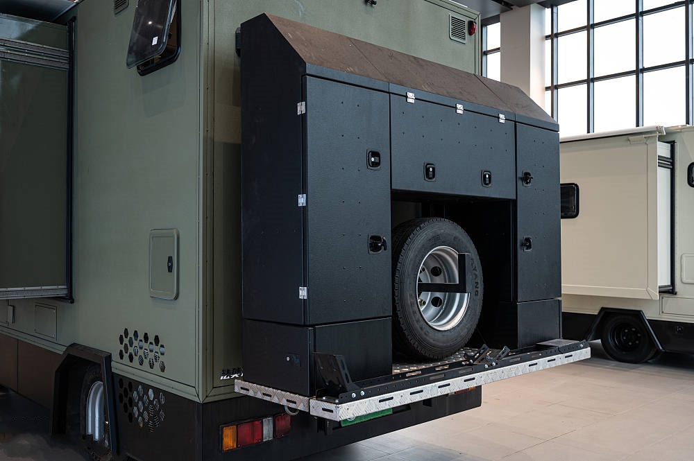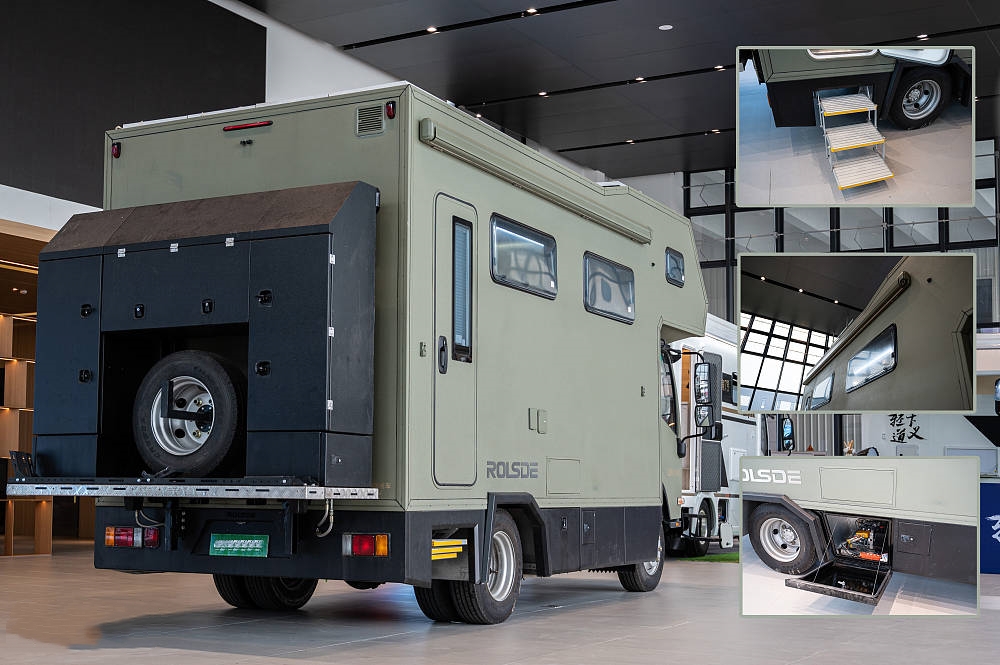 除了內(nèi)部常規(guī)的衣柜和吊柜之外,五十鈴700P最大的儲物倉位于車廂后方的全鋁背包,完全滿足儲物、外置抽拉柴油灶、摩托車架、備胎等功能,無論是長途穿越還是多人旅行,無論多少行李都能夠滿足。