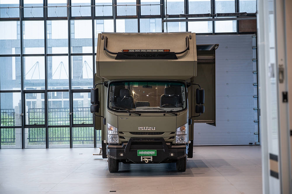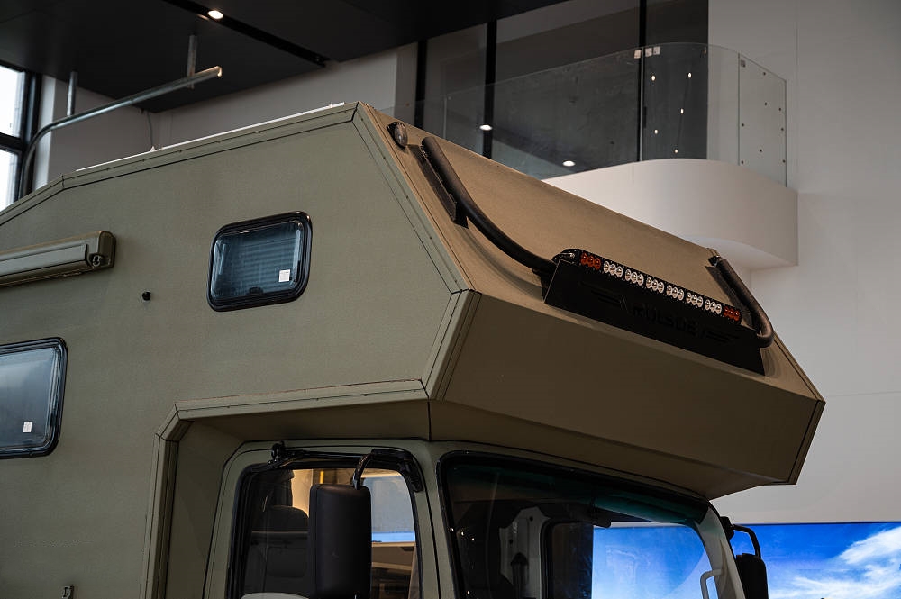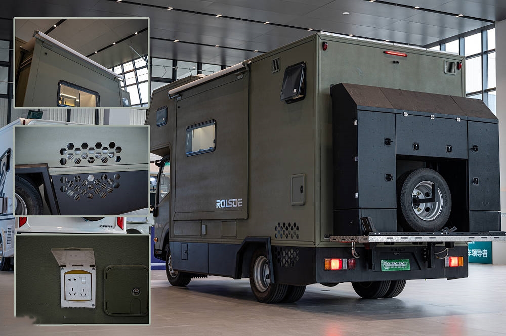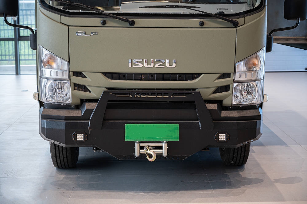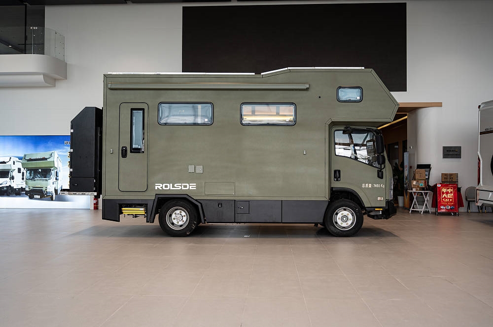 五十鈴700P房車大量使用標志性的硬派越野元素和棱角分明的方形線條設(shè)計,全車噴涂軍綠色中顆粒防爆漆給人一種堅固耐用的直觀感受,方正的車身輪廓也更適合提供更多的空間和載重能力。