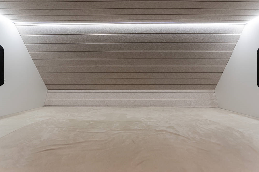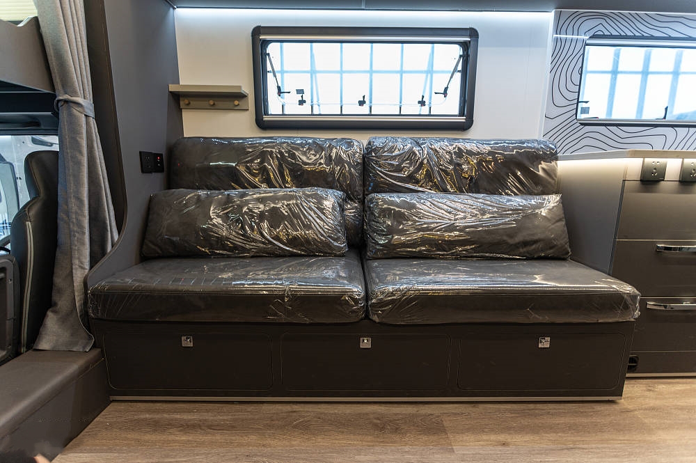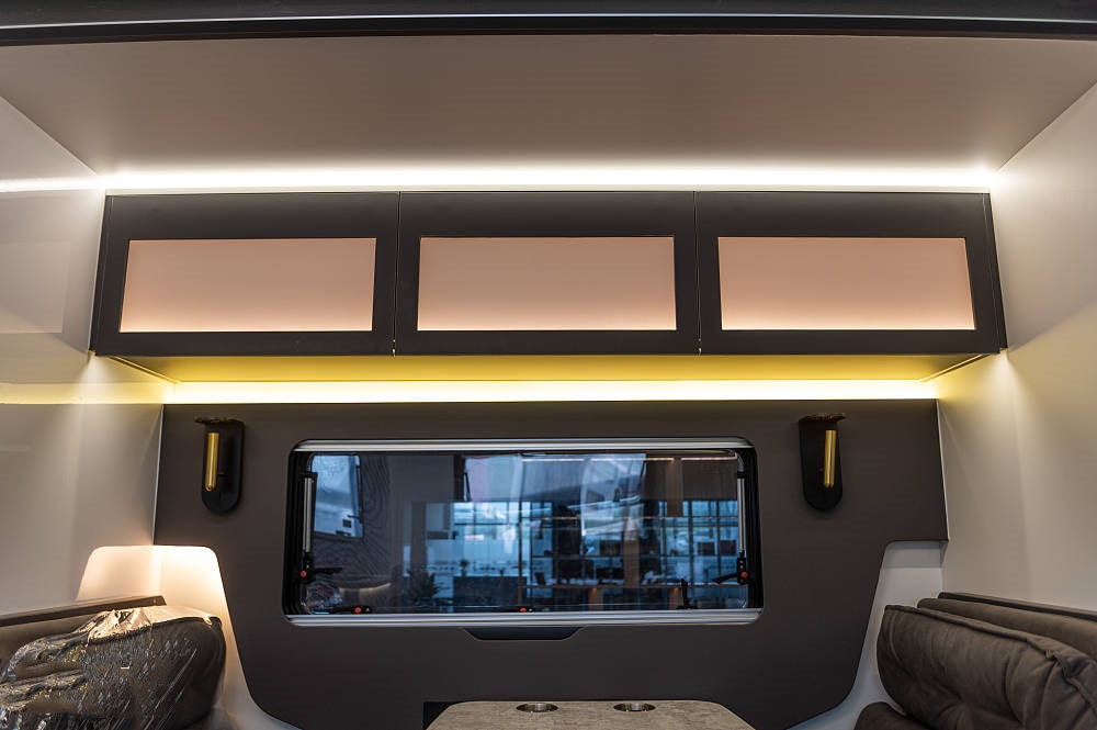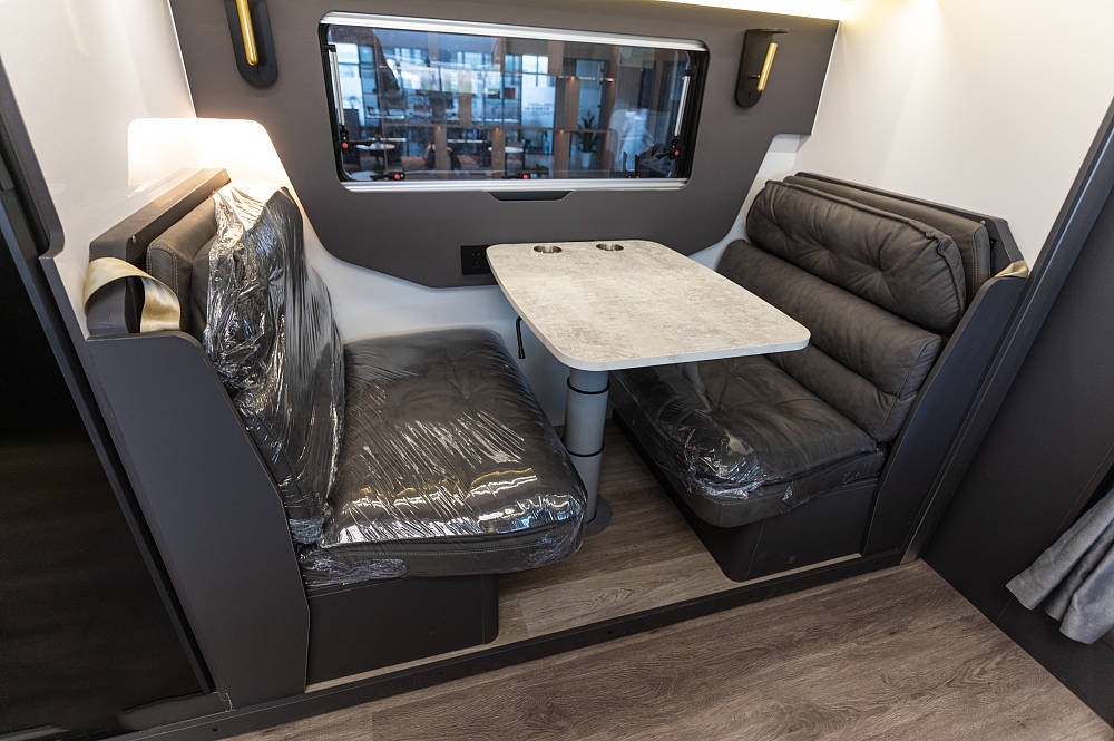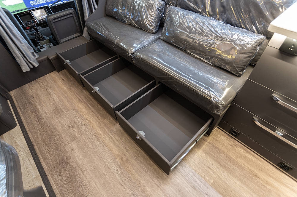 會客區(qū)的側(cè)拓展區(qū)域放置了深灰色對卡座沙發(fā),方便在此用餐、辦公等,相比競品車型,五十鈴700P的對卡座沙發(fā)在橫、縱向空間優(yōu)勢明顯,在坐墊長度、厚度以及邊緣腿部承托力方面都進行了全面強化。中間為一張氣動升降餐桌可四向平移,設(shè)有杯槽,操作便捷。將升降桌降下后可以與對卡座拼成一張臨時床鋪睡臥使用。座椅上方有三段式儲物格,方便隨時起身拿取隨身物品。車廂燈光采用當下流行的無主燈照明系統(tǒng),懸浮式氛圍燈光,光線均勻,明暗和諧,使得車內(nèi)空間更有層次感。