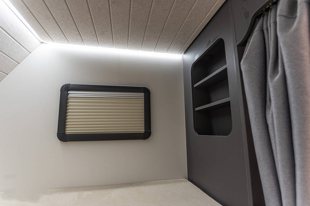 額頭雙人床位于駕駛室上方也是車內(nèi)唯一的固定床位,尺寸為2200×1550×850(mm),可觀的內(nèi)高使得成年人坐直沒有問題,左右兩側(cè)均配有外推窗,方便了額頭床的通風和透光。影視娛樂方面,額頭床下方裝配有一臺40寸網(wǎng)絡(luò)智能電視,可以觀看喜歡的影視劇。