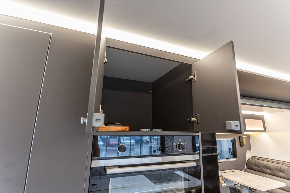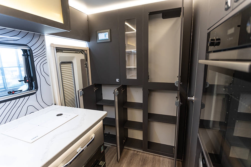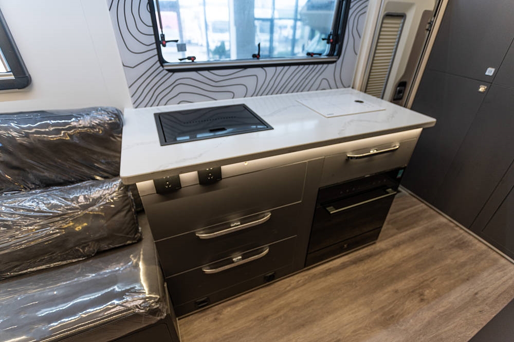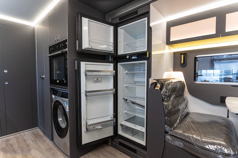 來到車廂中后部就是功能完備的廚房區(qū),白色石英石定制臺面之上配備了內(nèi)嵌式電陶爐、不銹鋼折疊式洗菜池,灶臺下方為多個廚具儲物抽屜、2個標準電源插板和洗碗機,上方為一組三段式儲物吊柜。