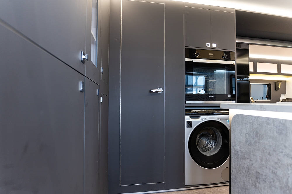 后方高柜之中內(nèi)嵌有西門子蒸烤箱,西門子滾筒洗衣機,224L超大容量雙開門冰箱,食物儲存無煩惱。也是得益于超大的內(nèi)部尺寸,才可以在廚房布局上從容不迫,各種出點配置應(yīng)有盡有。