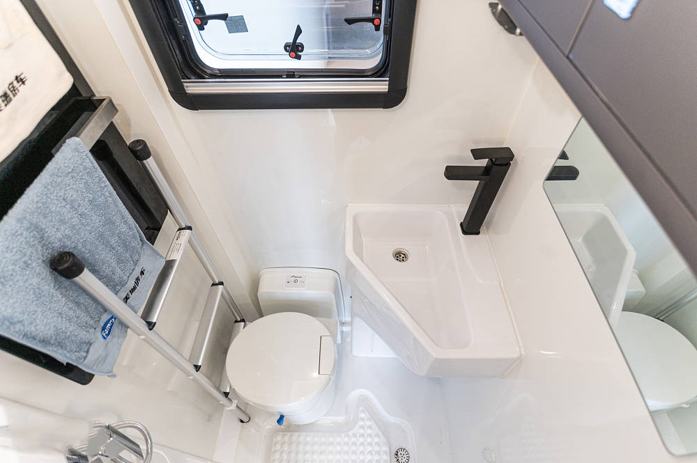 衛(wèi)浴區(qū)為常見的獨立式干濕一體布局,整體使用吸塑防水處理,能夠有效減少漏水發(fā)霉等情況的發(fā)生,也方便清理打掃。不管是站立洗澡還是使用馬桶都不會感覺空間狹小,衛(wèi)生間內(nèi)部設(shè)施齊全,配備旋轉(zhuǎn)馬桶、洗手池、化妝鏡、淋浴系統(tǒng)、毛巾架、儲物柜等等,滿足了衛(wèi)生間所需的設(shè)施和功能。