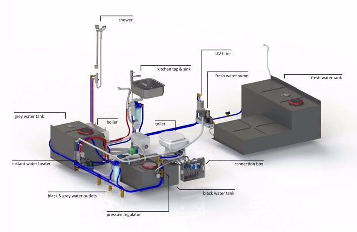 整車配有3個(gè)水箱:一個(gè)清水箱、一個(gè)灰水箱和一個(gè)污水箱。清水箱安裝在產(chǎn)品的前面,灰水箱和污水箱都安裝在后面。水箱位置安排是總設(shè)計(jì)的要求,以確保產(chǎn)品重量達(dá)到最佳平衡。為了保證供水質(zhì)量,水管系統(tǒng)中集成了幾個(gè)過濾系統(tǒng)。當(dāng)過濾清水箱中的水時(shí),水從沉淀濾芯通過。水要經(jīng)過沉淀、活性碳和紫外線過濾器后,才能使用,以保證所用水百分百的清澈干凈,安全為最重要。
