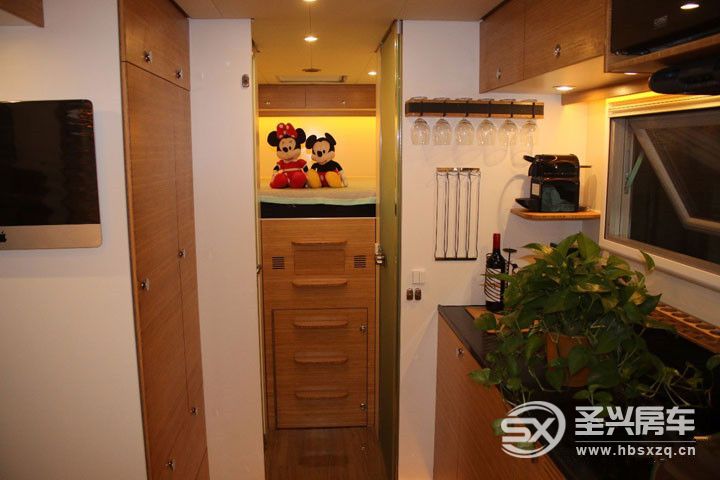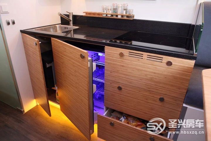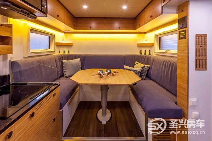 車廂內(nèi)部不僅提供了所有居家設(shè)施,而且還有周密的多功能設(shè)計(jì),為您提供一個(gè)溫馨而誘人的空間使您的旅途更加愉快。主要配有固定尺寸的舒適雙人床、一6個(gè)人的U形沙發(fā)(可轉(zhuǎn)換為一張雙人床)、設(shè)備齊全的廚房、一個(gè)寬敞的臺面與集成的電磁爐。盥洗室和浴室分開,90度的時(shí)候淋浴房門可以分隔間生活和睡眠功能區(qū)。位于床下還安置有一臺滾筒洗衣機(jī)。