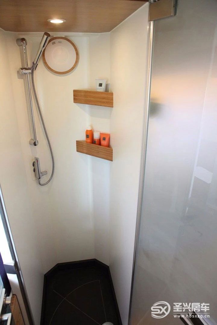 車廂內(nèi)擁有一個(gè)與廁所隔開的浴室,大小為785(長)x 600(寬)mm,凈高為2010mm,該浴室空間足以讓人享受清爽沐浴。浴室內(nèi)配備了強(qiáng)大的冷/熱沐浴噴頭、Corian浴盆、以及帶有自動百葉窗的排氣扇。熱水由24升電熱鍋爐供應(yīng)。
