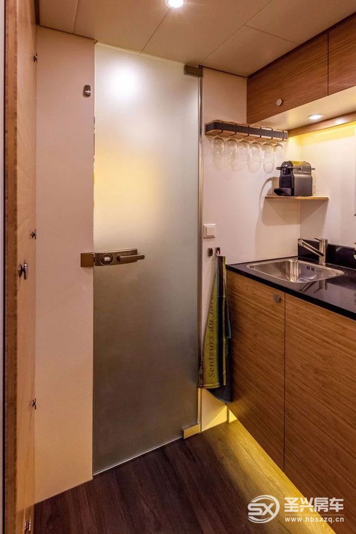 由于車輛裝備了565升的水罐,因此將不會出現(xiàn)清潔用水供應(yīng)不足的情況。浴室與廁所均安裝了10mm厚度的鋼化玻璃門,凸顯豪華裝飾。在標(biāo)準(zhǔn)配置車型中,浴室門擁有兩種關(guān)閉位置。當(dāng)以90度位置關(guān)門時(shí),通過將(浴室與廁所之間的)通道臨時(shí)轉(zhuǎn)換為浴室空間,實(shí)際上形成了一個(gè)更衣室。這樣,可以增加浴室空間,避免浪費(fèi)寶貴的內(nèi)部空間。