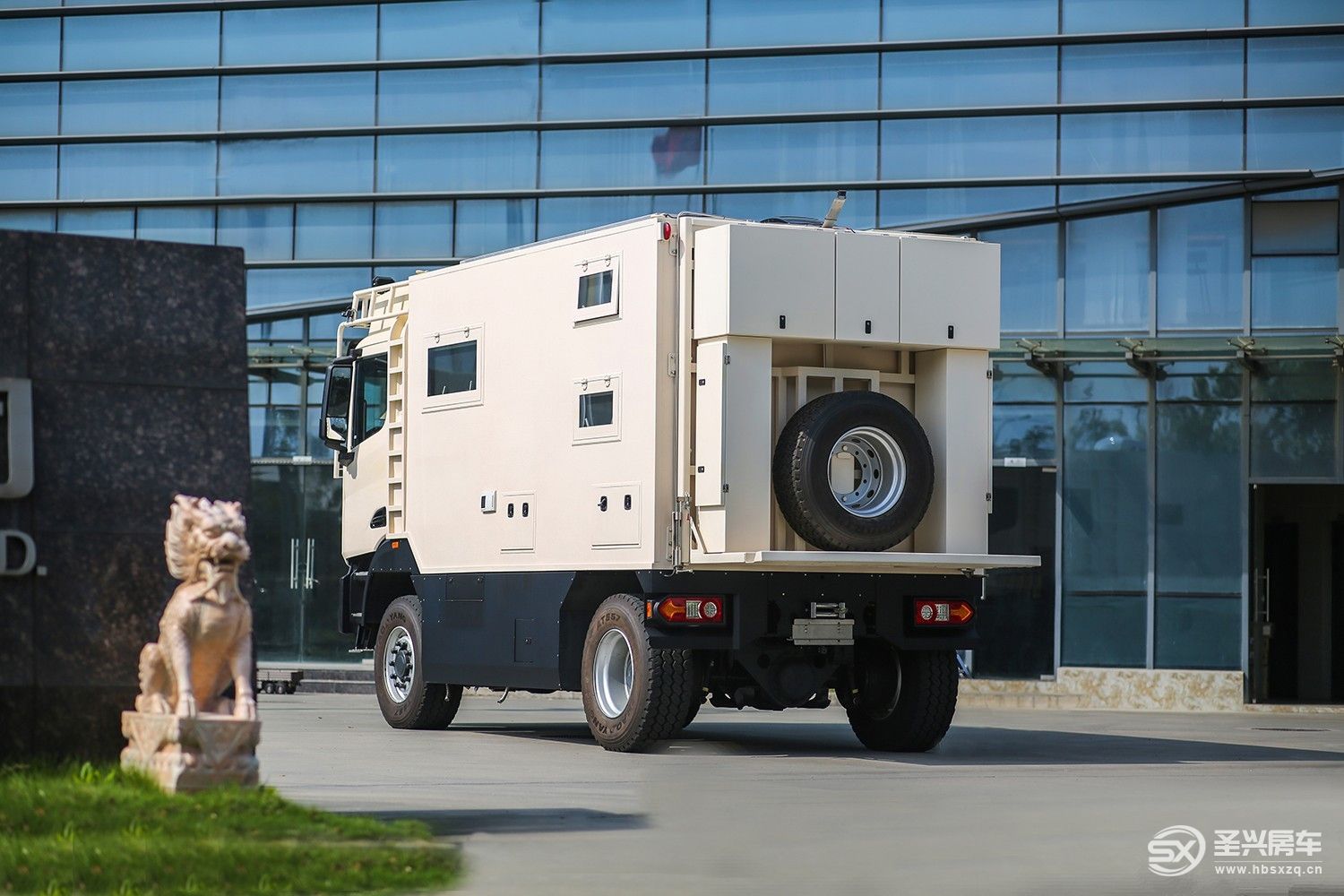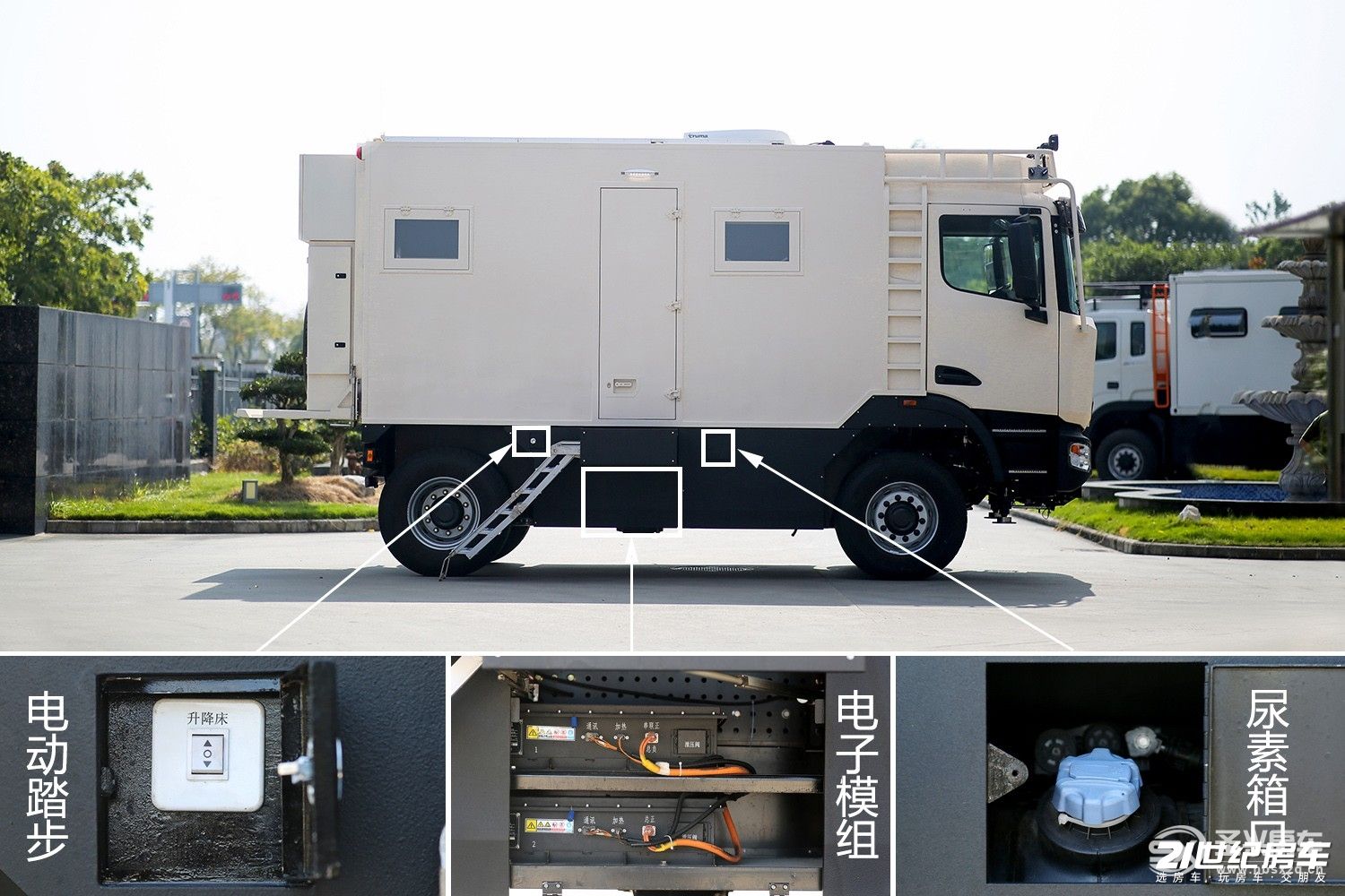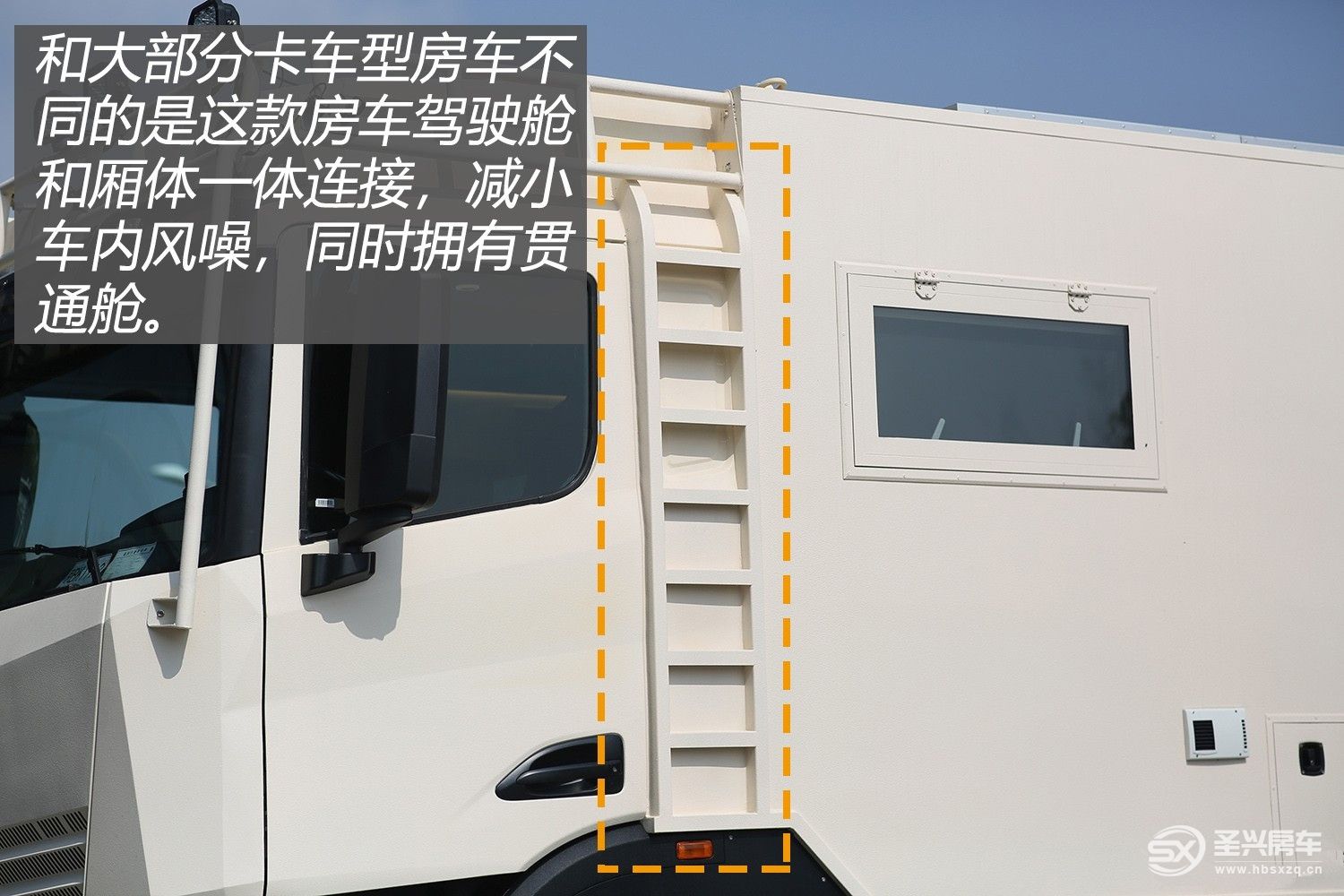 目前我們看到的同類產品,幾乎很少有駕駛室與后方生活區全貫通的設計,太脫拉四驅房車不僅做到了全貫通,而且美觀性方面也可圈可點,我們可以看到駕駛室和廂體之間采用硬連接,接縫處安裝了上車爬梯,硬連接可以非常明顯的降低風噪。如果是半貫通設計,廂體和駕駛室中間則是橡膠圈連接,行駛中的風會全部被擠壓至橡膠圈位置,形成“渦流”,那么傳至車內的風噪聲以及混雜的發動機聲音會非常難受。
