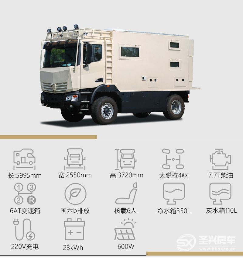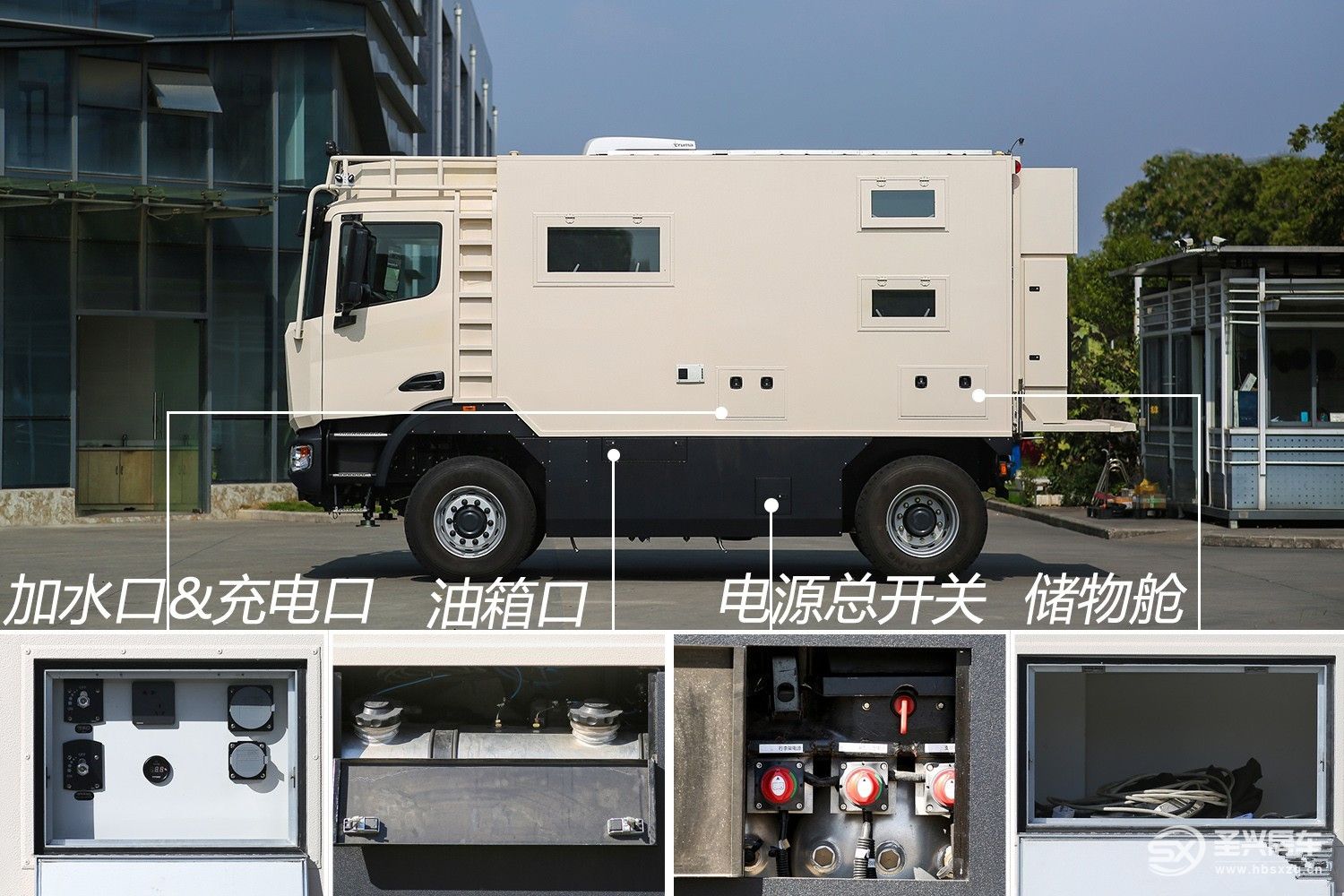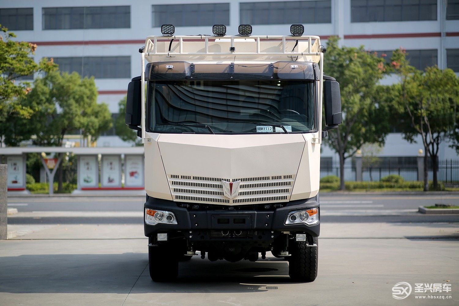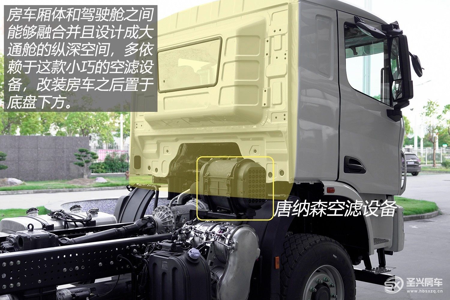 目前我們看到的同類產品,幾乎很少有駕駛室與后方生活區全貫通的設計,太脫拉四驅房車不僅做到了全貫通,而且美觀性方面也可圈可點,我們可以看到駕駛室和廂體之間采用硬連接,接縫處安裝了上車爬梯,硬連接可以非常明顯的降低風噪。如果是半貫通設計,廂體和駕駛室中間則是橡膠圈連接,行駛中的風會全部被擠壓至橡膠圈位置,形成“渦流”,那么傳至車內的風噪聲以及混雜的發動機聲音會非常難受。