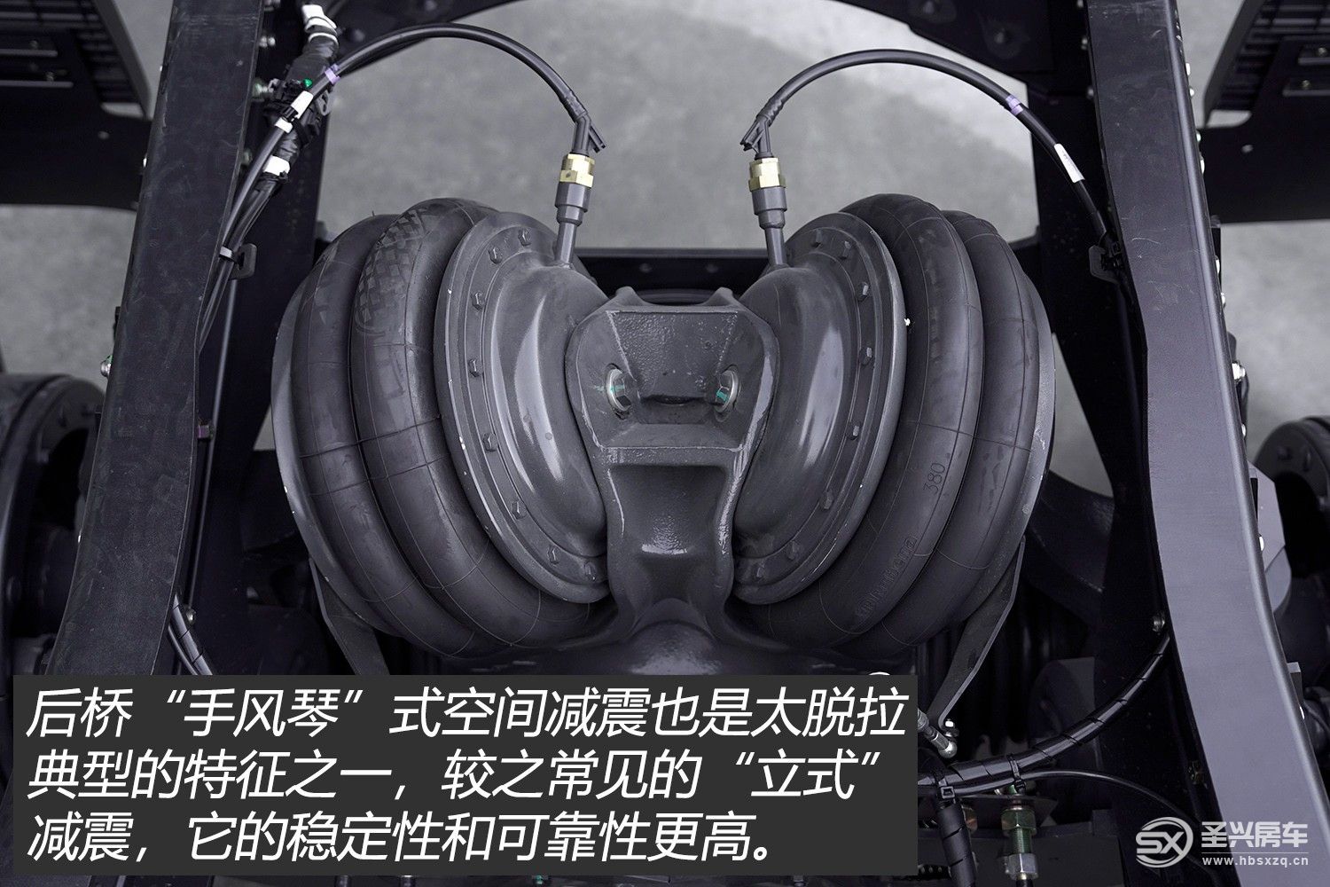 “手風琴”式空氣減震基本上是“V”型排列,而我們常見的后橋空間減震都是“立式”,這種“V”型減震承擔的安全性更高,因為它的位置在后橋之上,被縱梁以及半軸等設備所包圍起來,極大化的避免了被割傷、剮蹭的風險。另外,該空間減震的橡膠內部采用的是鋼絲作為強力支撐,強度和剛性都能夠保證。我們所了解到的太脫拉非常具有特點的“內八字”經過空間減震的調校基本上已經避免了“吃胎”的情況。