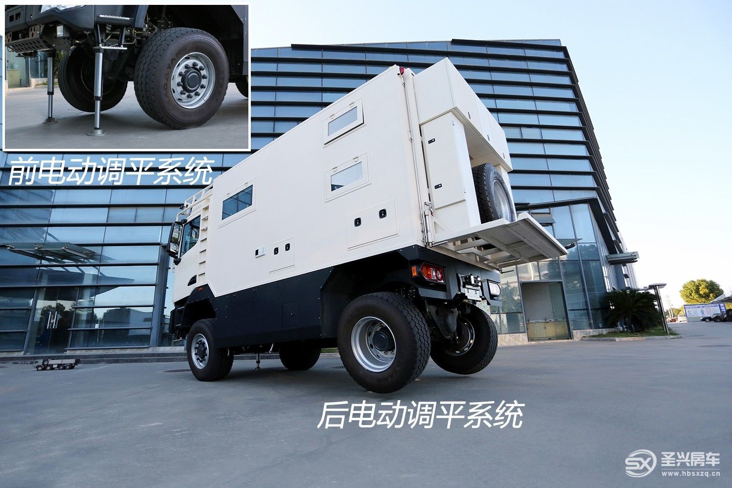這款車配備了前后四個電動調平支腿,支持一鍵升降,每個支腿的最大支撐重量為5噸,對于這款自重為12噸的房車來說,四個支腿支撐自然不成問題,當然它的最大用處是在后期維修換胎的時候,起到千斤頂的作用。