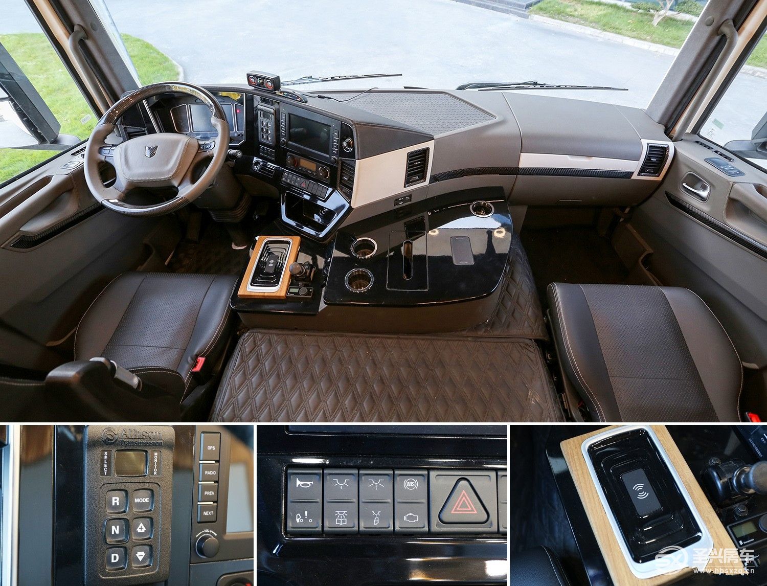 駕駛室方面,典型的重卡設計,大部分功能型按鍵都是以實體按鍵形式分布,而且面向的駕駛員位置,貼合用戶的實際操作習慣。由于廂體寬度較大,正副駕駛席兩人之間還隔著比較寬敞的平臺,對于駕駛室內的人來說前風擋碩大的玻璃,帶來君臨天下的大視野。這款車的采用電子按鍵的換擋方式,配備有獨立的駐車檔桿。動力方面,這款車搭載一款7.7T柴油發動機,最高功率257kW,峰值扭矩1350N·m。傳動系統方面,匹配美國艾利遜6AT變速箱,帶有全時四驅系統。
