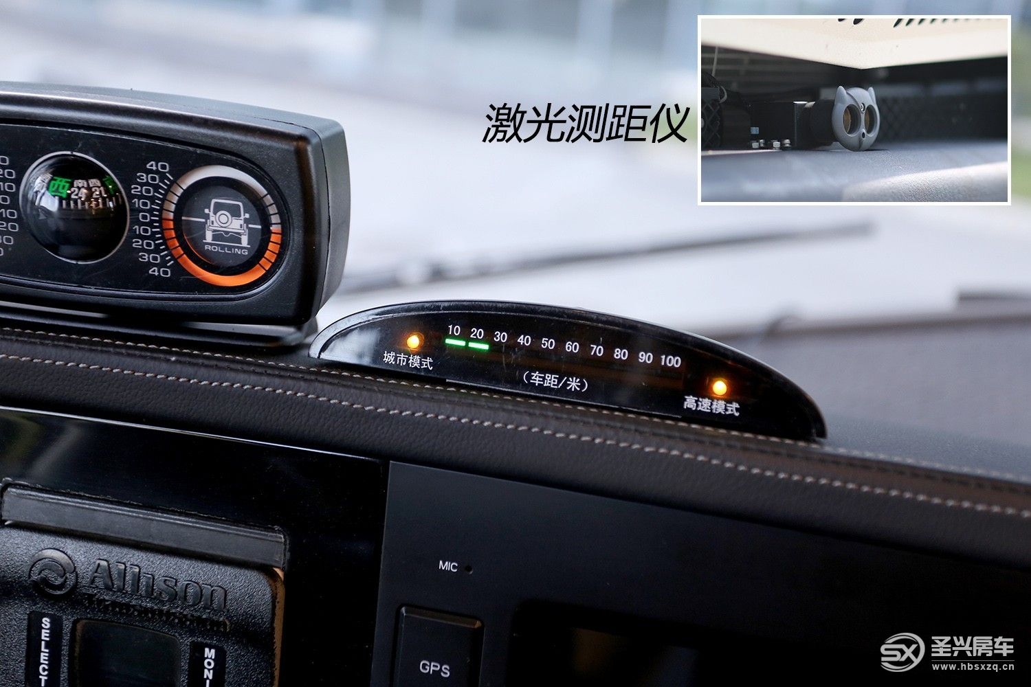 這款車在安全輔助系統方面做的也比較到位,除了定速巡航系統以外,還加入了激光測距儀的設備,我們在車外前保險杠的位置可以看到3個貓眼的小設備,它就是激光測距儀,同時將其連接至中控臺上的接收設備,當車輛距離前車100米的位置開始發出蜂鳴聲,當車距低于10米時,因為跟車太近而采取主動剎車。我們實際在路上進行了測試,它的準確度非常高,有時候因為跟車太近會導致剎車比較突然的情況,但一定程度上會保護車輛或者前車。