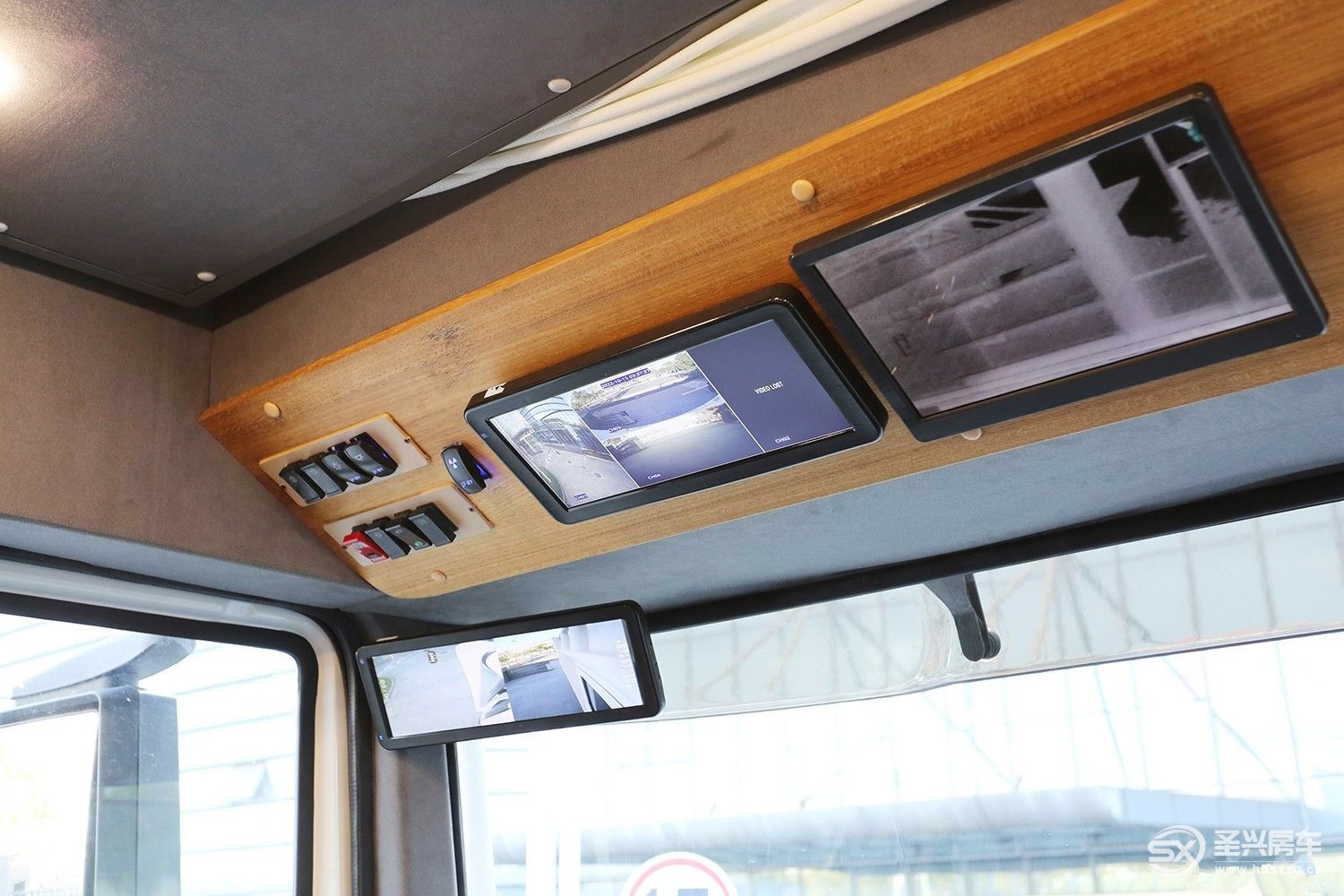 駕駛室頂部還有若干塊顯示屏,包含了4路監控屏,紅外夜視儀顯示器以及一些原車自帶的功能,比如油箱加熱功能、原地再生功能、預熱冷啟動功能等等。