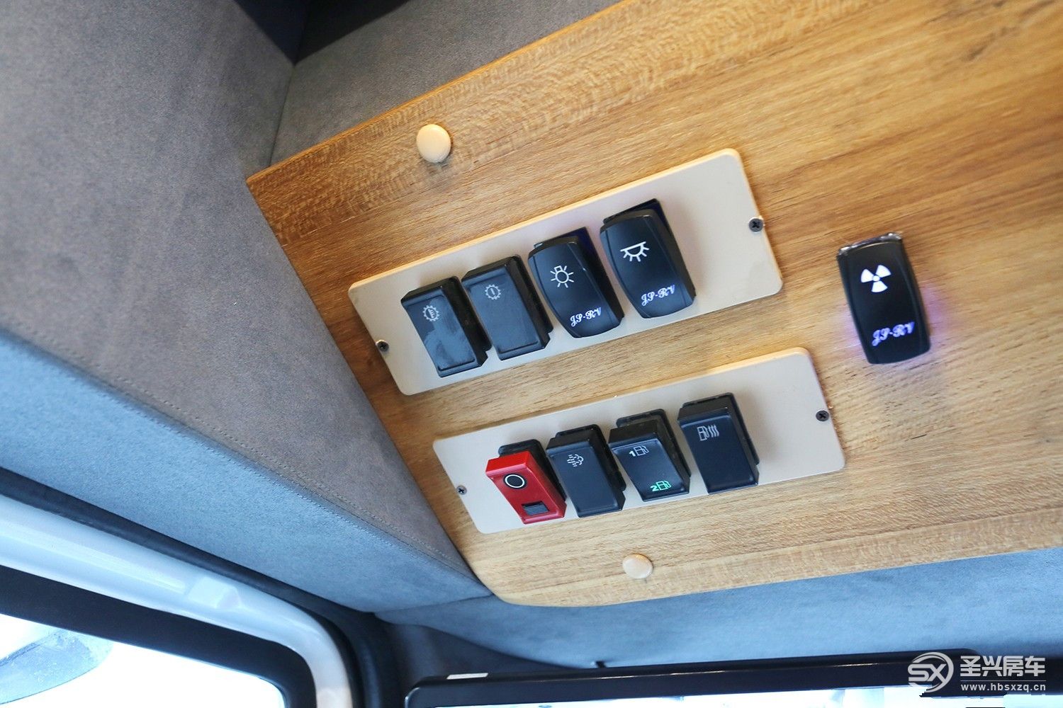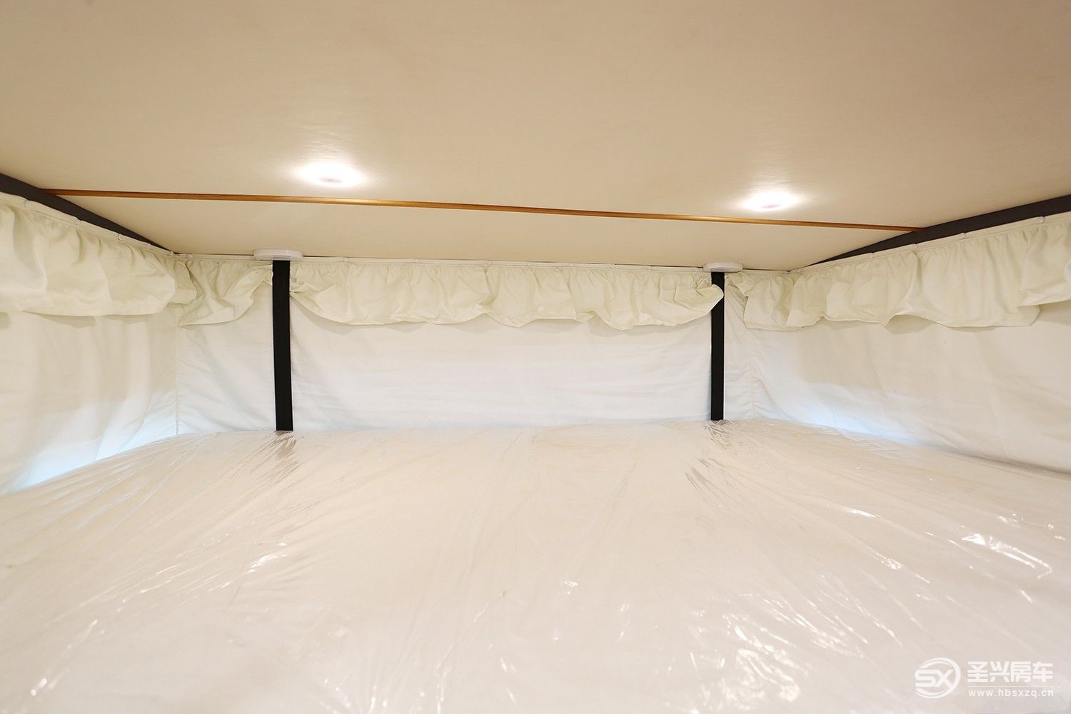 這款車做到了全貫通的處理,這絕對是重卡房車中少有的,全貫通帶來的優勢不言而喻,縱深感明顯,同時車內采光也要更加通透。另外,全貫通之后使得駕駛室頭部的空間有了被利用的可能,因此這張頂部吊床是來之不易的,它的尺寸達到了2400×1500(mm),絕對是同級別中的最大尺寸。