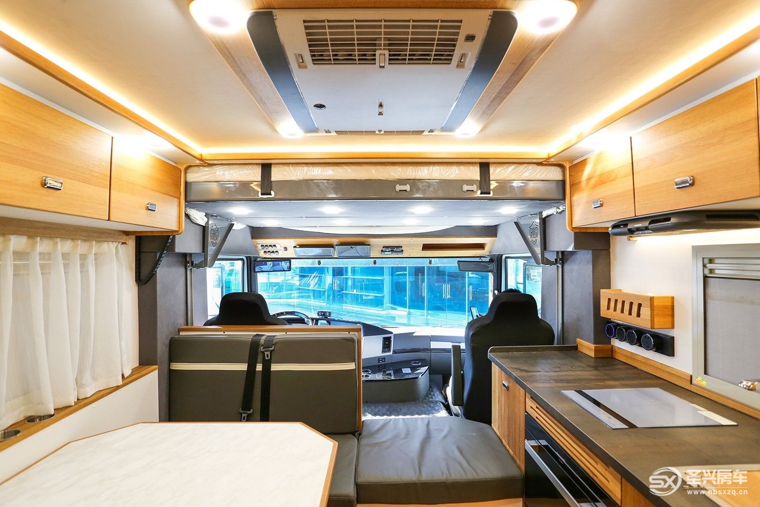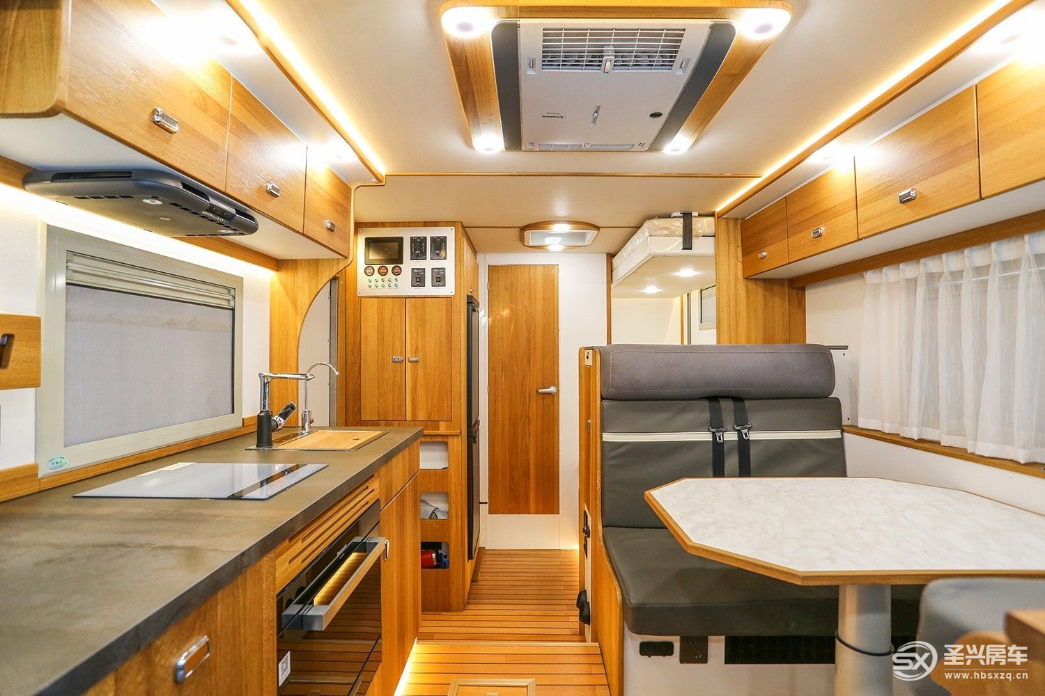 來到車內,我們會發現整個車內的風格統一采用暖黃色系,首先營造的氛圍感還不錯,由于其整個貫通艙的設計,在空間縱深感方面表現尤其好。布局方面,采用前置4人卡座會客區,中置廚房區,后置縱床+衛生間的基礎格局,最大可以滿足4-5人的常規居住。