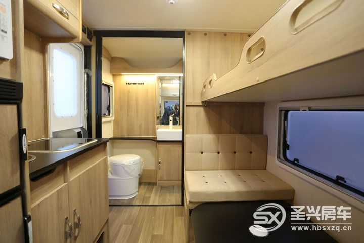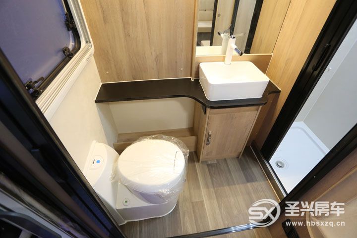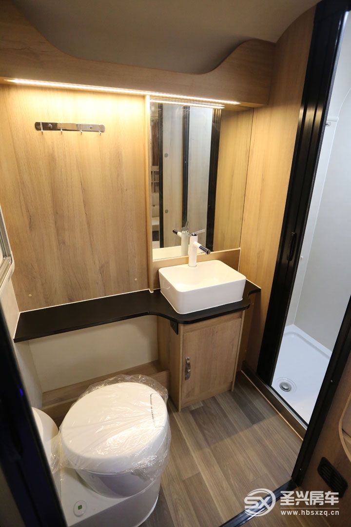 后部的設計是該車的亮點所在!干濕分離的大衛浴間,外部是防水推拉門。配置有進口電動馬桶、陶瓷洗臉盆、外推窗、儲物格、毛巾架、儲物柜、化妝鏡,內部的獨立淋浴間則配置了淋浴花灑、12V雙向換氣扇。