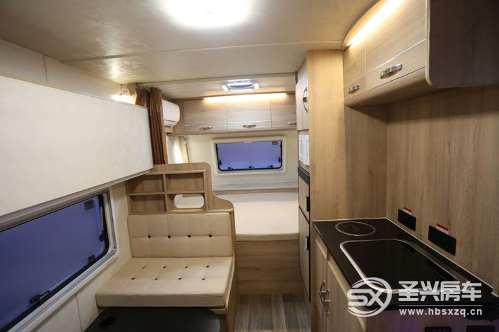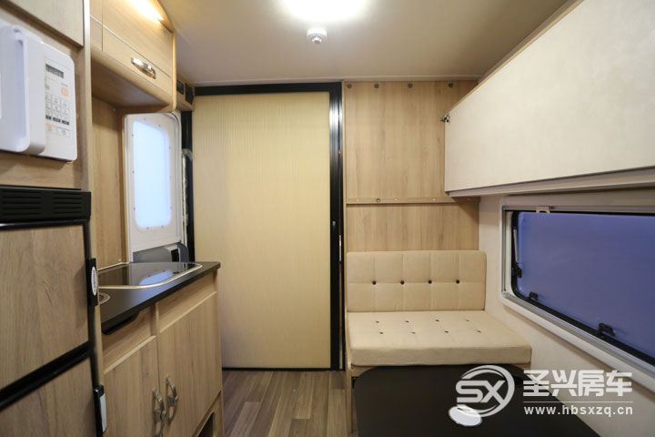 會客區對面設計為新車的內廚房區域,一體式多功能櫥柜配置有電磁爐、帶蓋板的不銹鋼洗菜盆、118L房車專用雙開門冰箱、進口微波爐,上方有兩組多個五孔插座,頂部是吊柜,下部也是儲物的柜子。