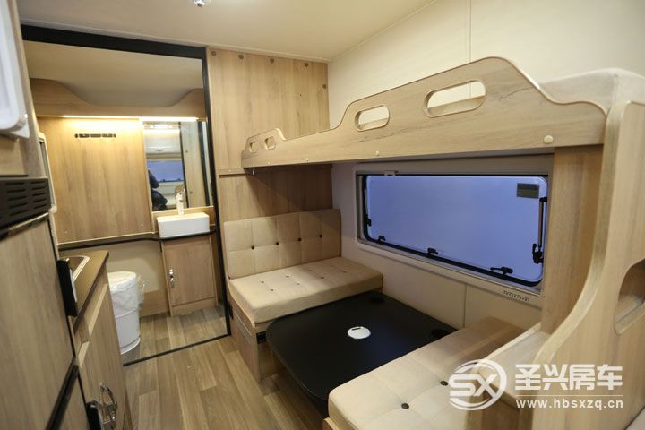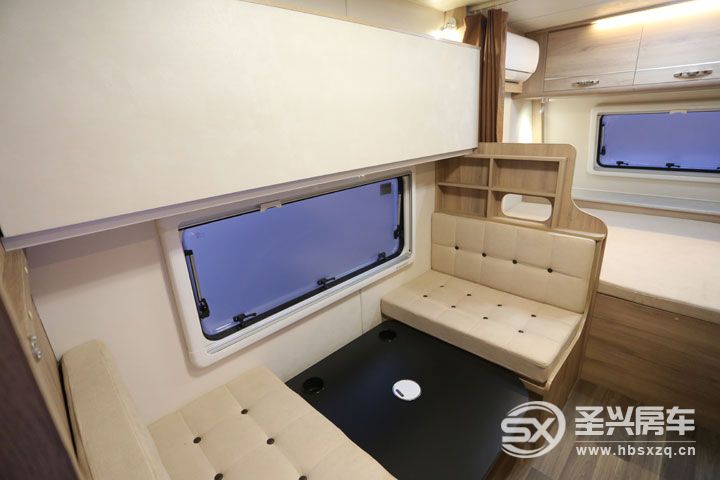 新車有著寬敞舒適的大客廳,設計有雙人對坐式的卡座沙發,中間配置有一張升降式餐桌,餐桌降下之后能拼成一張2000*1000mm單人床,內側是一扇長度近1米的外推窗,坐在這里看風景便可盡收眼底。值得一提的是愛旅490全系車窗均采用雙層隔熱保溫防紫外線隱私車窗,并且車窗與箱體貼合也十分緊密,風阻系數小。卡座上部是一張翻折式上鋪,床板可掀起固定不會影響下部卡座區的使用。